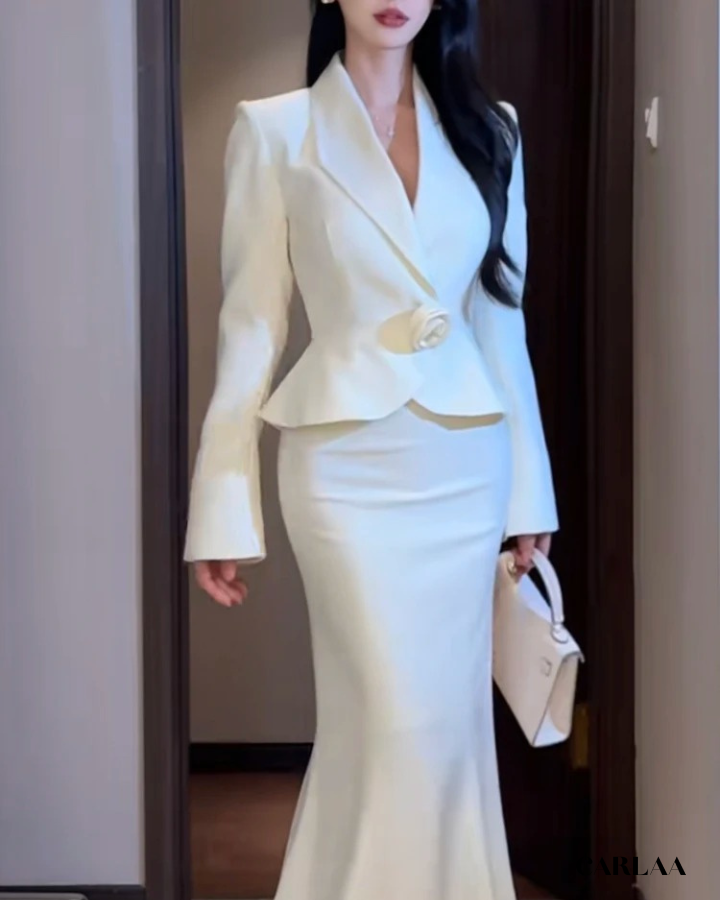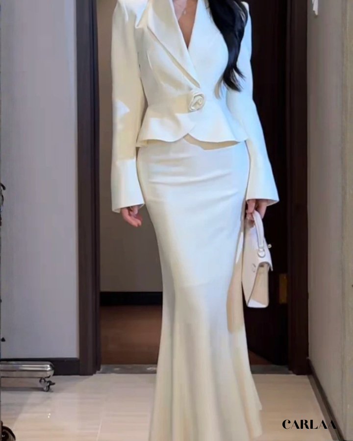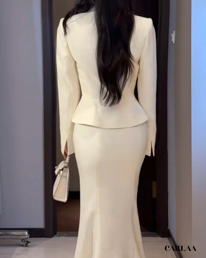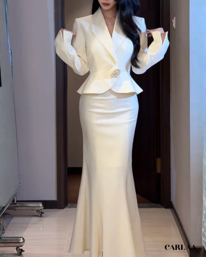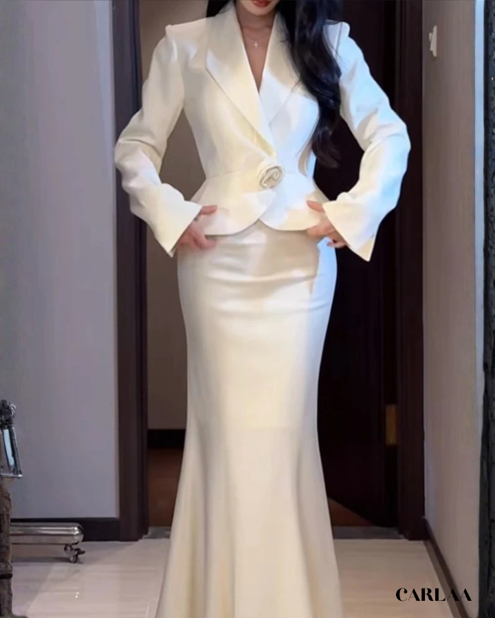 Offre-toi ce sublime tailleur jupe femme mariage civil qui célèbre l'élégance moderne avec une sophistication incomparable. La veste courte structurée arbore un col châle imposant et des manches aux poignets évasés qui créent un mouvement gracieux à chaque geste. La coupe ajustée cintrée met en valeur ta silhouette tandis que le bouton ornemental apporte cette touche de raffinement signature qui fait toute la différence. La jupe longue à coupe sirène fluide glisse le long de tes courbes avec une sensualité maîtrisée, créant une allure résolument glamour et féminine. Cet ensemble d'exception réinvente le tailleur traditionnel en y insufflant une modernité audacieuse parfaite pour ton mariage civil ou toute cérémonie élégante. Le décolleté en V sublime ton port de tête tandis que la ligne épurée de l'ensemble garantit une présence remarquée. Choisis cette pièce intemporelle qui allie pouvoir, féminité et sophistication pour marquer les esprits lors de ton jour unique.