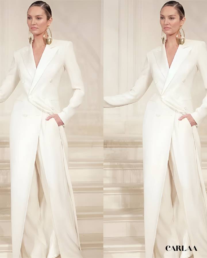 Que tu choisisses de l’associer à des talons raffinés ou à des accessoires minimalistes, ce tailleur incarne une élégance intemporelle et te permet d’affirmer ton style avec audace et féminité. C’est la pièce parfaite pour une mariée moderne qui veut être à la fois chic et inoubliable.