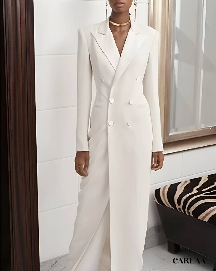 Sa coupe longue et structurée apporte une élégance saisissante, idéale si tu veux briller sans robe traditionnelle. Le blazer croisé, parfaitement ajusté, souligne la taille tout en allongeant la silhouette, tandis que le pantalon fluide apporte confort et allure.