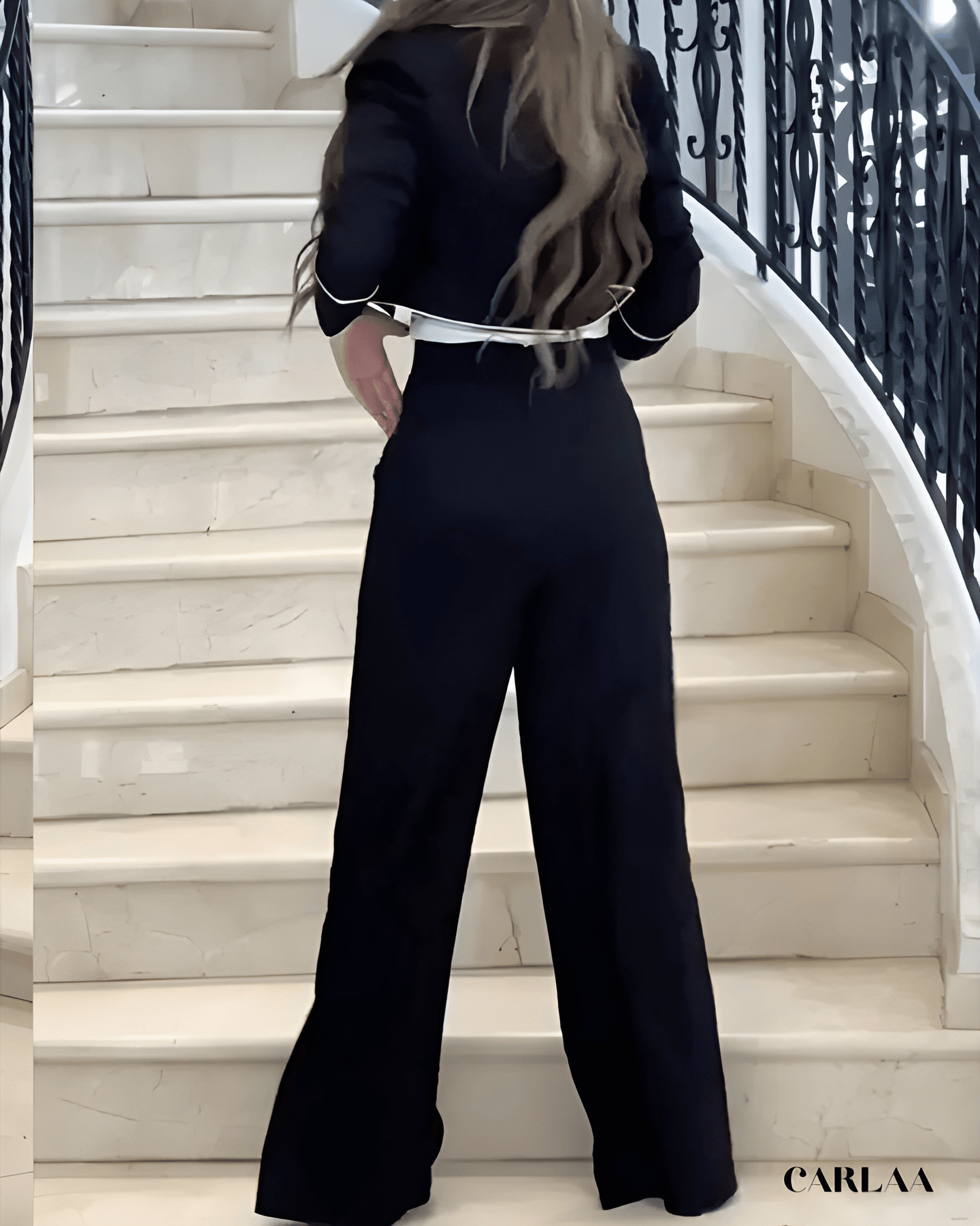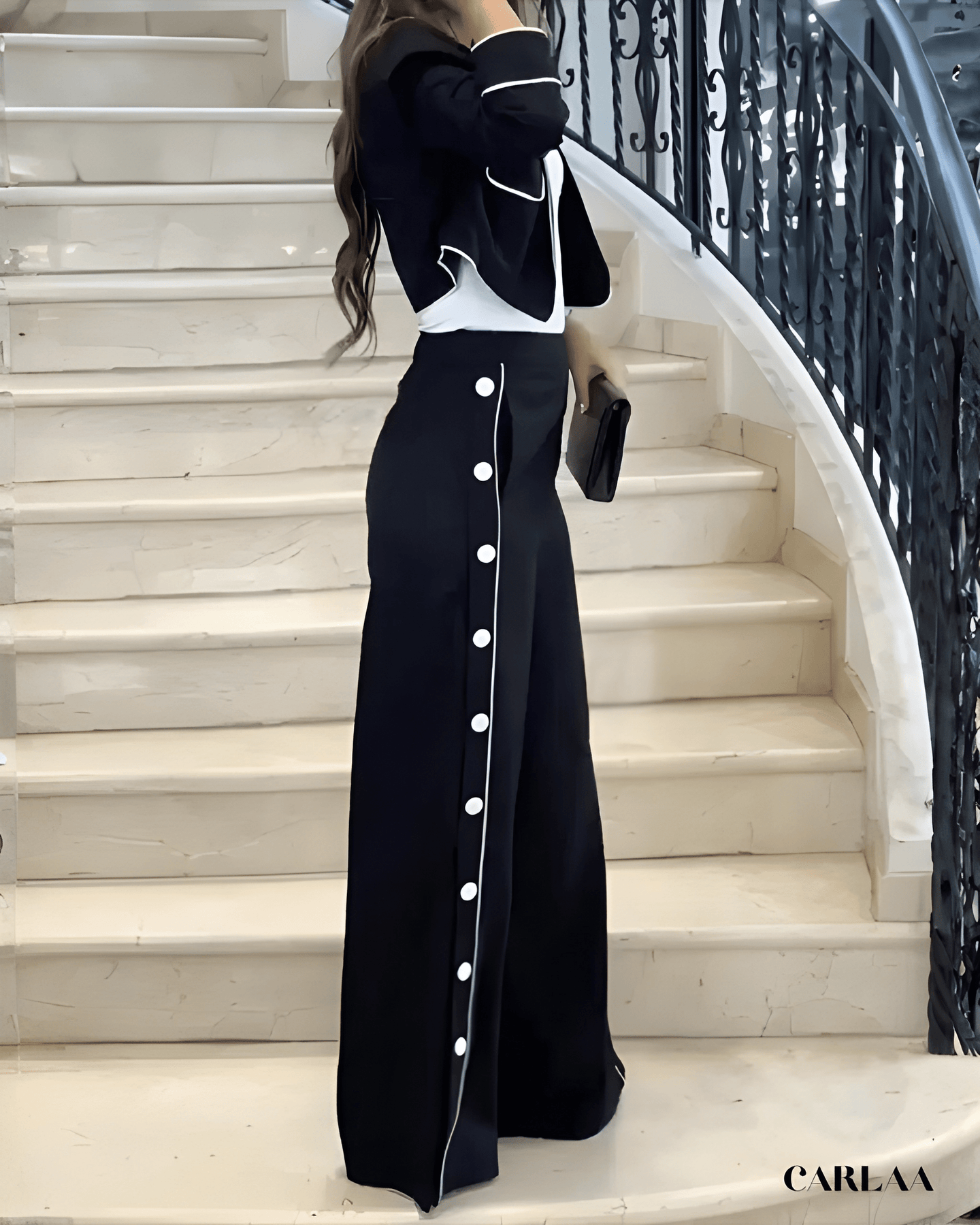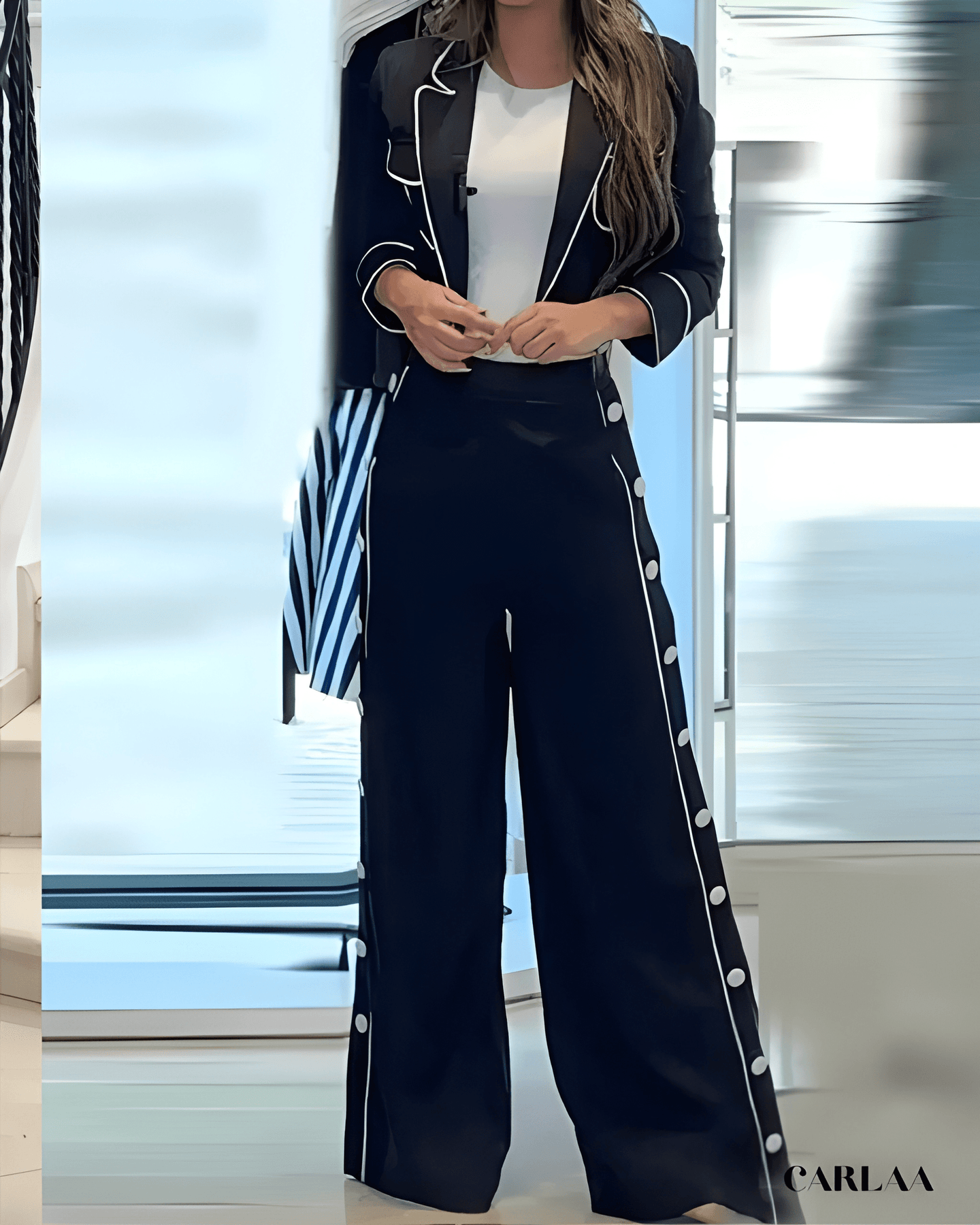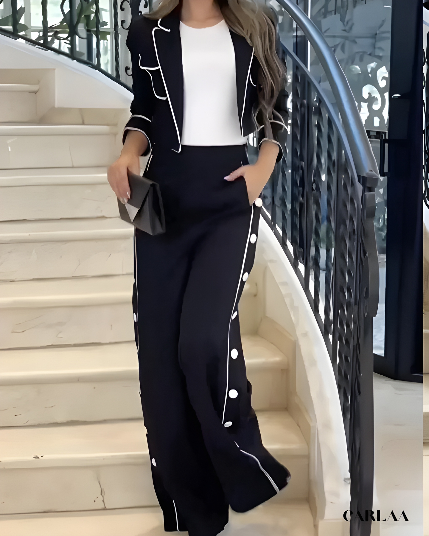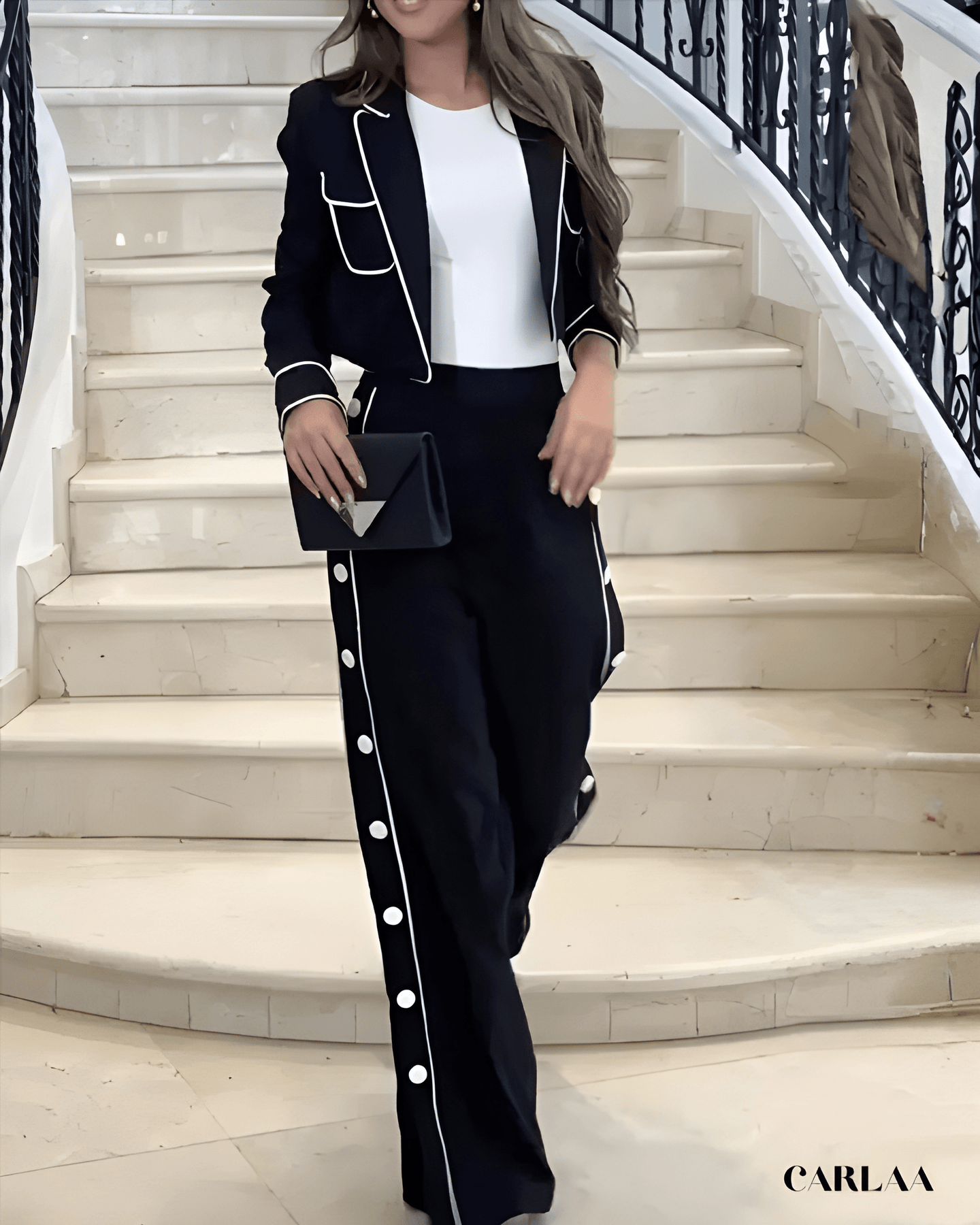 Impose ton style avec ce tailleur noir femme élégant qui réinvente le dress code classique avec des détails contrastés spectaculaires et sophistiqués. La veste cintrée se distingue par ses bordures contrastées qui soulignent chaque ligne avec précision et créent cet effet graphique saisissant. Les poches plaquées rehaussées de liserés attirent subtilement le regard tandis que les manches longues aux poignets soulignés ajoutent ce détail raffiné. La coupe ajustée sculpte ta silhouette avec élégance professionnelle tout en conservant une allure moderne et contemporaine. Le pantalon palazzo à taille haute arbore une bande latérale ornée de boutons décoratifs qui crée cette dimension originale unique. Cette ligne verticale allonge infiniment ta silhouette tout en apportant ce détail luxueux qui te distingue. Cet ensemble incarne le parfait équilibre entre classicisme intemporel et modernité graphique assumée, idéal pour tes événements professionnels prestigieux. Les finitions contrastées témoignent d'une attention méticuleuse aux détails et d'un savoir-faire couture exceptionnel. Parfait pour les femmes qui recherchent sophistication et originalité dans leur garde-robe professionnelle. Investis dans ce tailleur iconique qui célèbre l'élégance moderne avec détails graphiques, raffinement absolu et cette touche d'originalité qui affirme ton style avec confiance et distinction professionnelle remarquable.