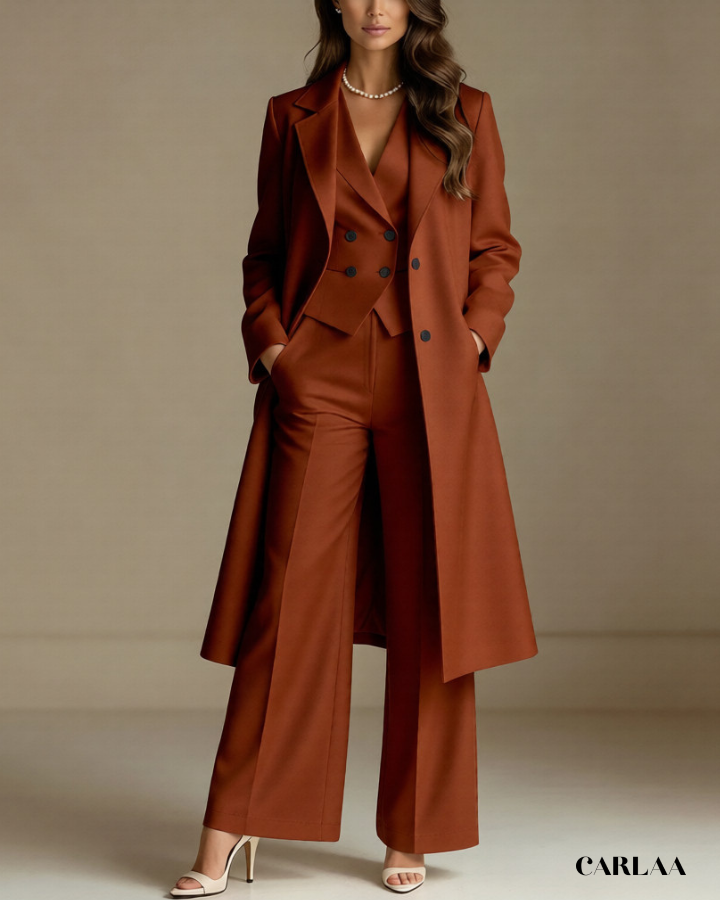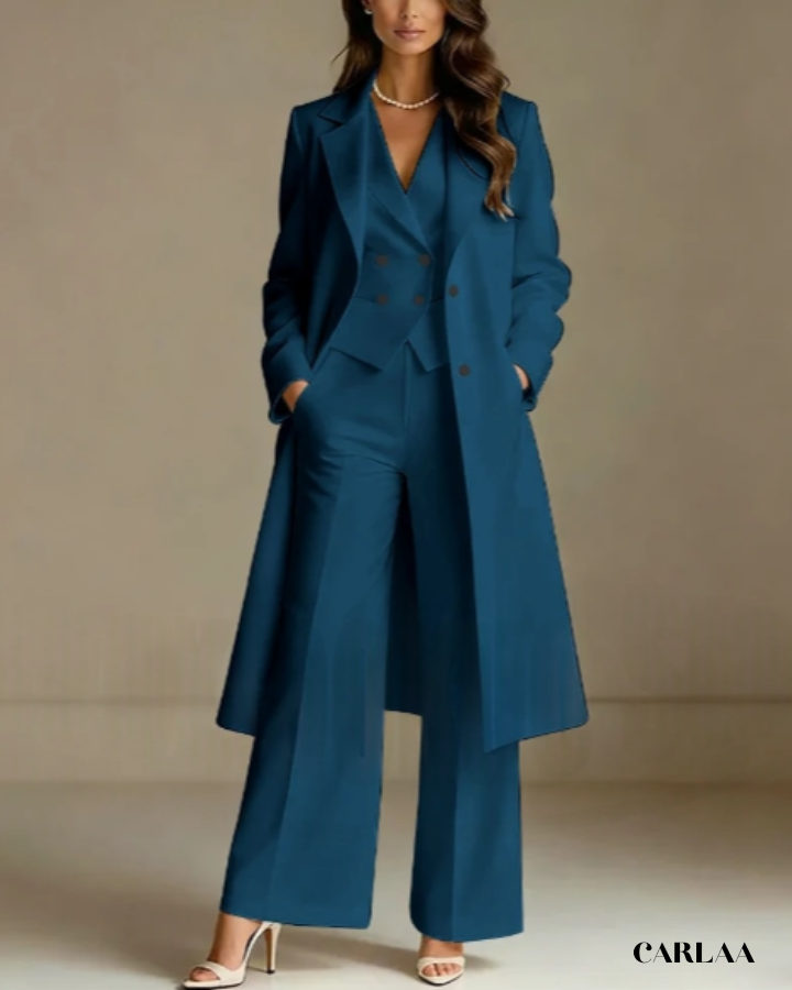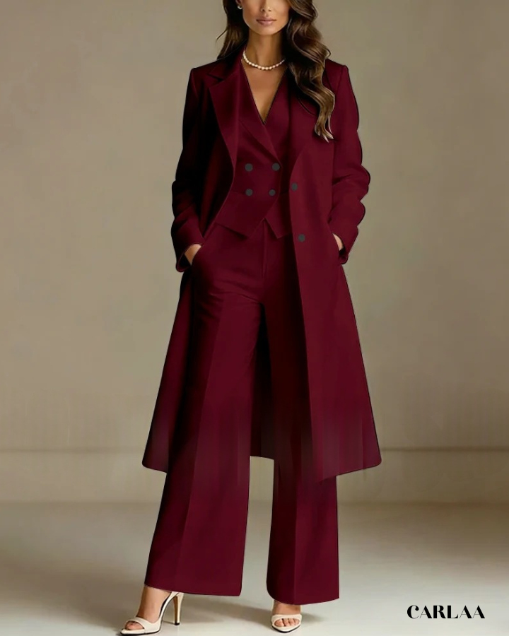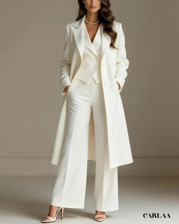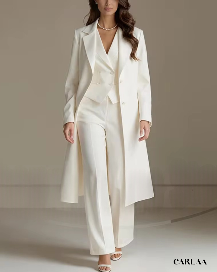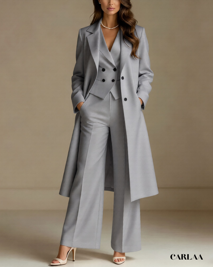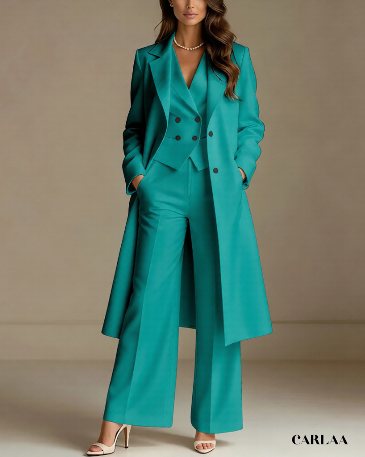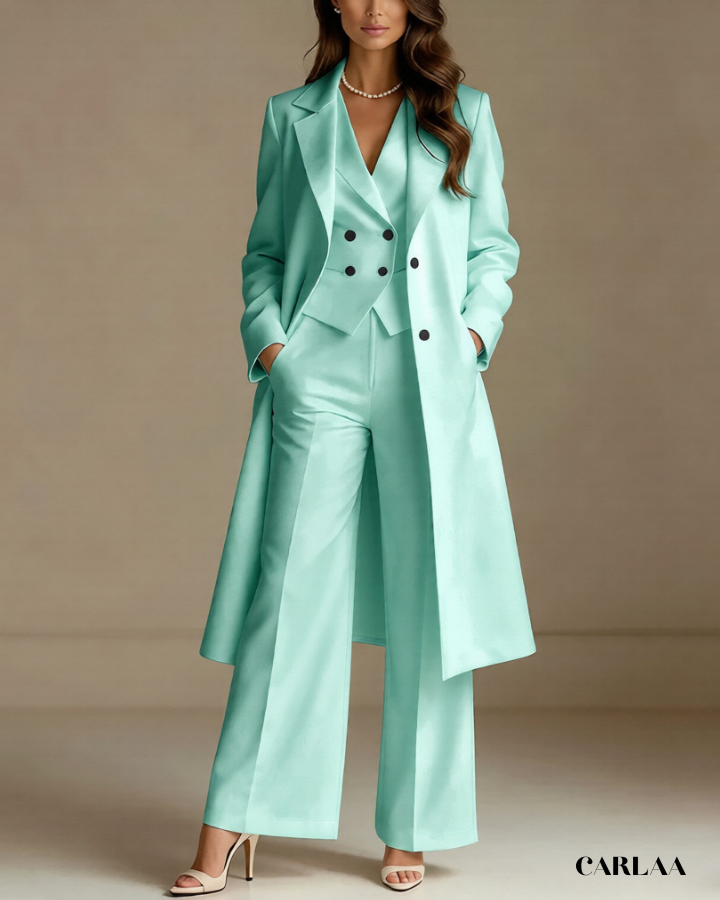 L'ensemble trois pièces coordonné te permet de moduler ton style avec sophistication selon les moments de la célébration. La longue veste cape croisée crée une silhouette majestueuse et allongée qui flatte harmonieusement toutes les morphologies avec une bienveillance remarquable. Le gilet ajusté en dessous sculpte délicatement ta silhouette tout en apportant cette structure flatteuse qui met en valeur ta féminité naturelle. Le pantalon droit à coupe classique offre un confort optimal tout en maintenant cette ligne épurée essentielle aux grandes occasions. Ce tailleur pantalon mariage femme 50 ans célèbre ta beauté mature avec un design qui comprend et honore l'évolution de ton corps. Les revers impeccables et la double boutonnière témoignent d'une attention méticuleuse aux détails qui caractérise les pièces d'exception. Accessoirise avec un collier de perles classique et des sandales raffinées pour incarner cette femme radieuse qui sait exactement qui elle est et ce qu'elle veut lors de toutes tes célébrations importantes.