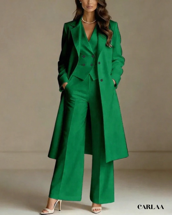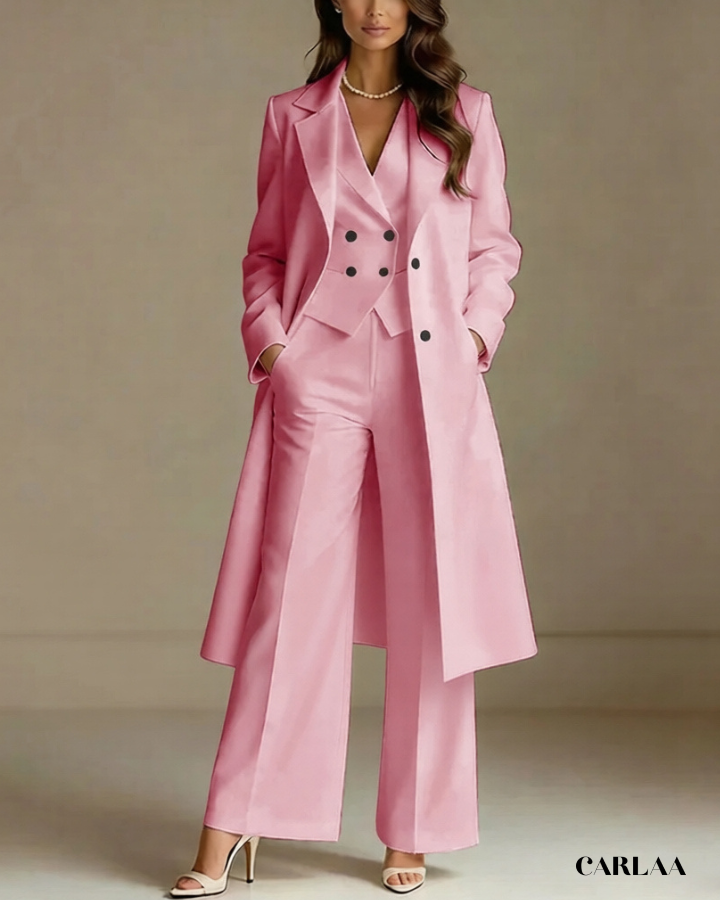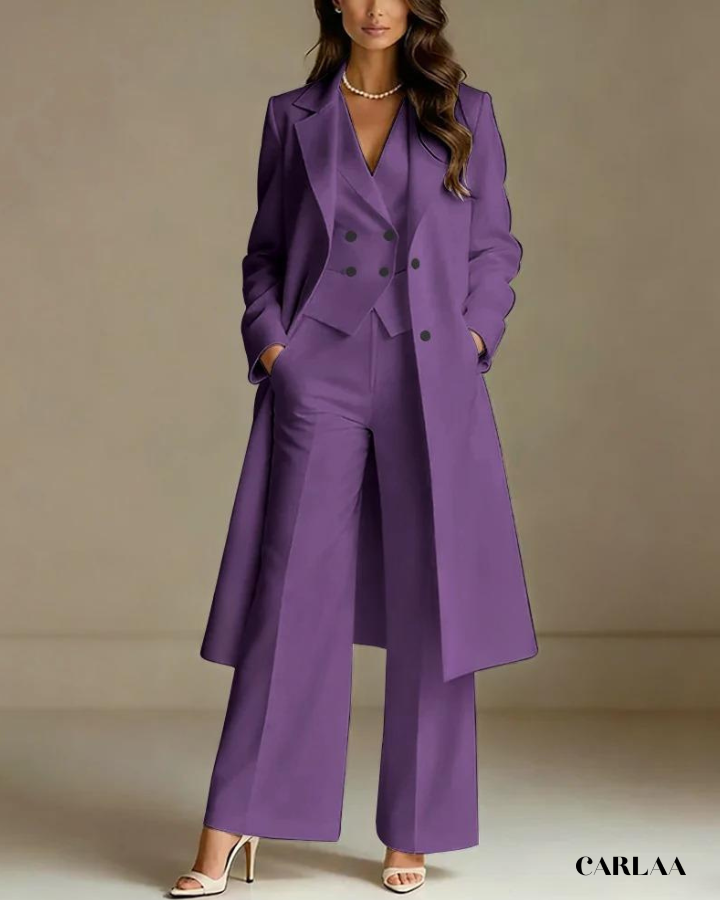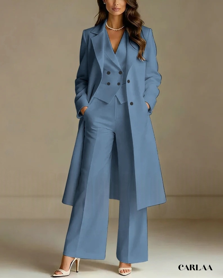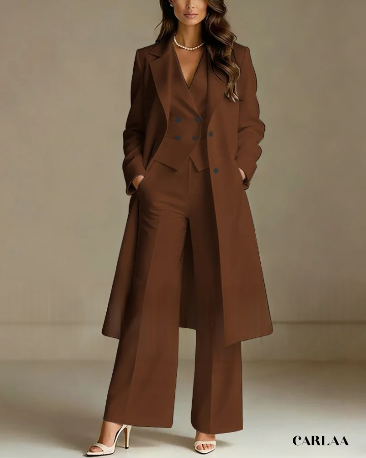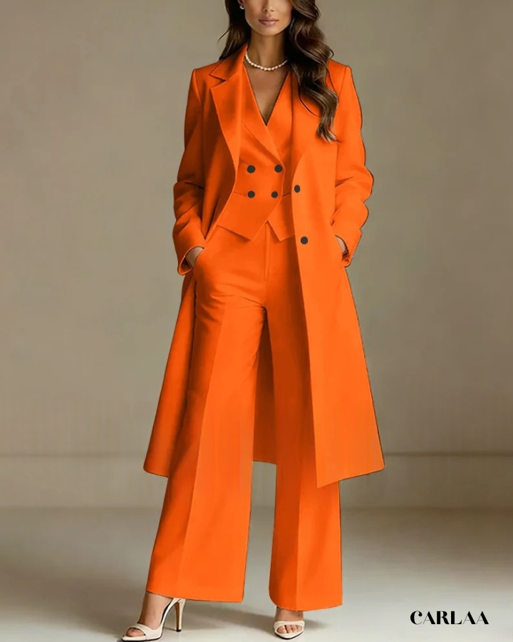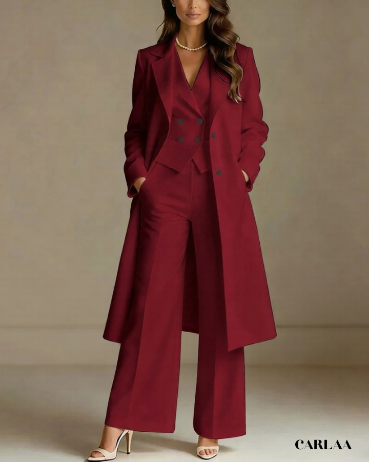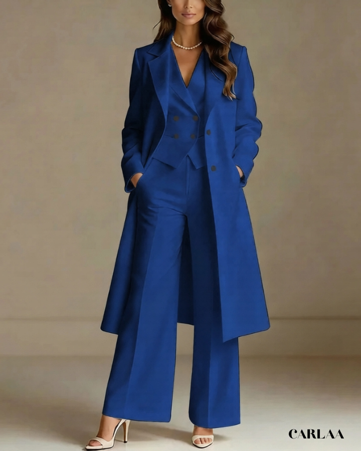 L'ensemble trois pièces coordonné te permet de moduler ton style avec sophistication selon les moments de la célébration. La longue veste cape croisée crée une silhouette majestueuse et allongée qui flatte harmonieusement toutes les morphologies avec une bienveillance remarquable. Le gilet ajusté en dessous sculpte délicatement ta silhouette tout en apportant cette structure flatteuse qui met en valeur ta féminité naturelle. Le pantalon droit à coupe classique offre un confort optimal tout en maintenant cette ligne épurée essentielle aux grandes occasions. Ce tailleur pantalon mariage femme 50 ans célèbre ta beauté mature avec un design qui comprend et honore l'évolution de ton corps. Les revers impeccables et la double boutonnière témoignent d'une attention méticuleuse aux détails qui caractérise les pièces d'exception. Accessoirise avec un collier de perles classique et des sandales raffinées pour incarner cette femme radieuse qui sait exactement qui elle est et ce qu'elle veut lors de toutes tes célébrations importantes.