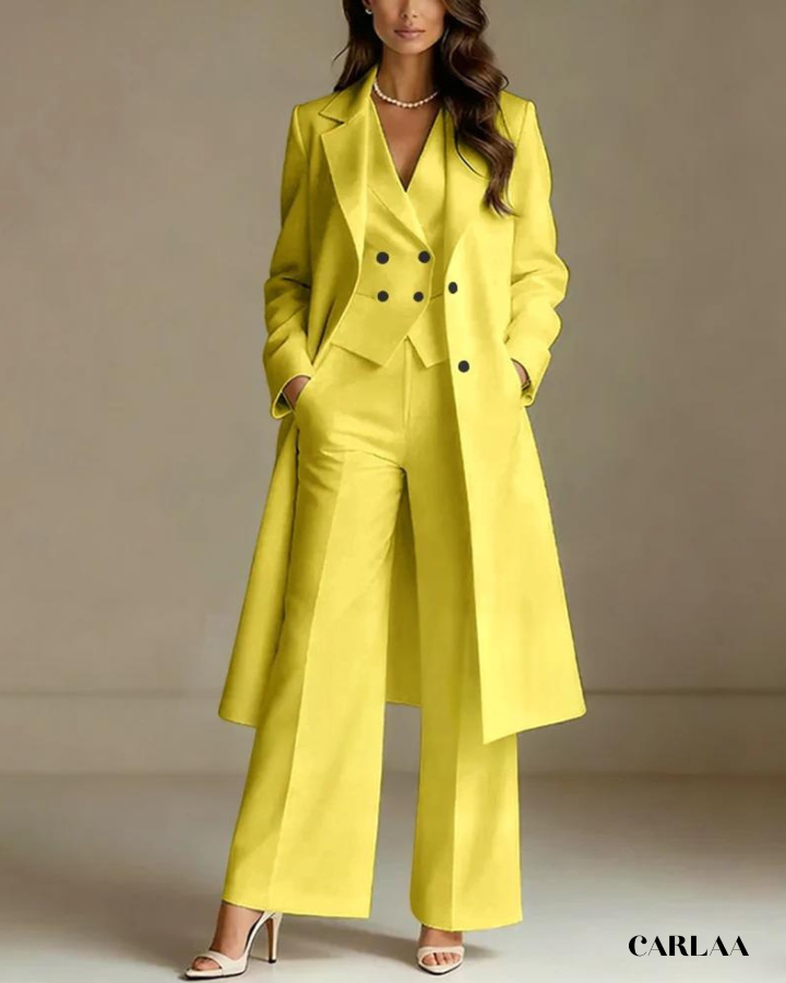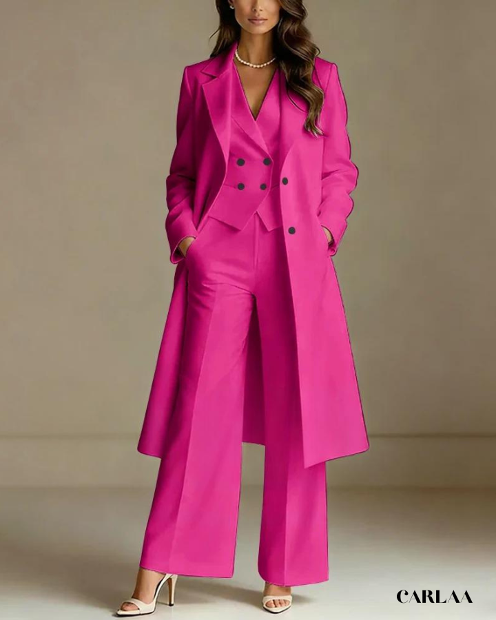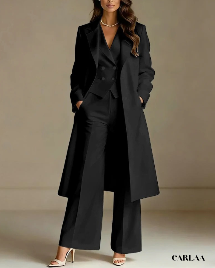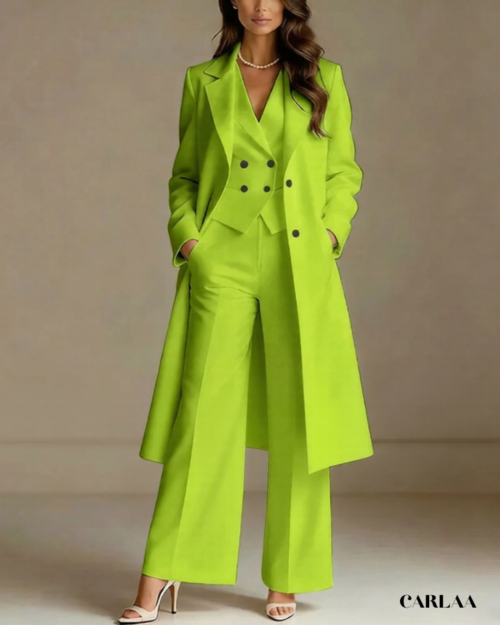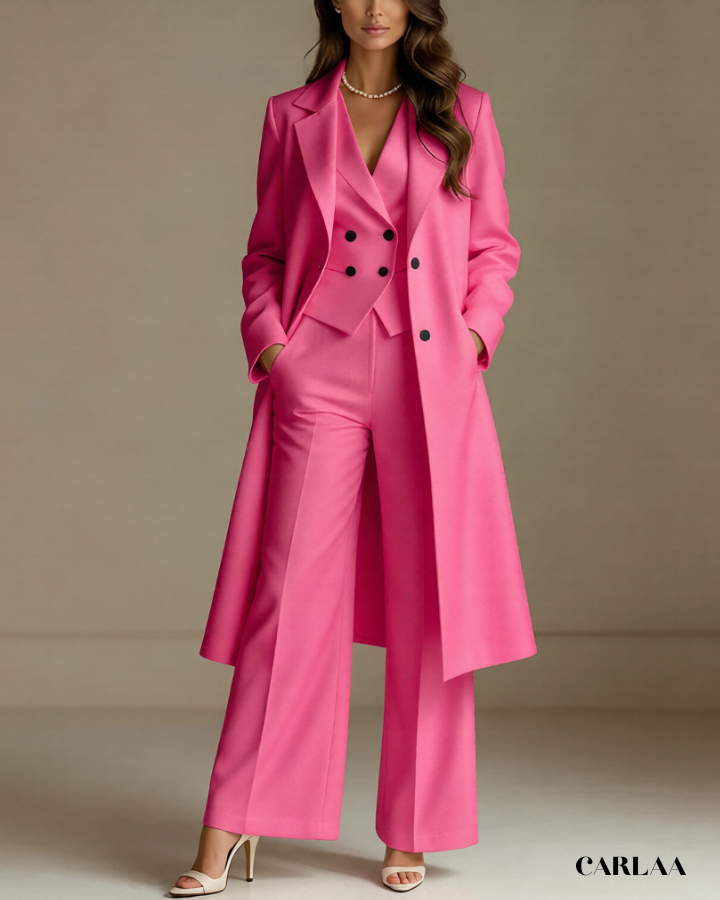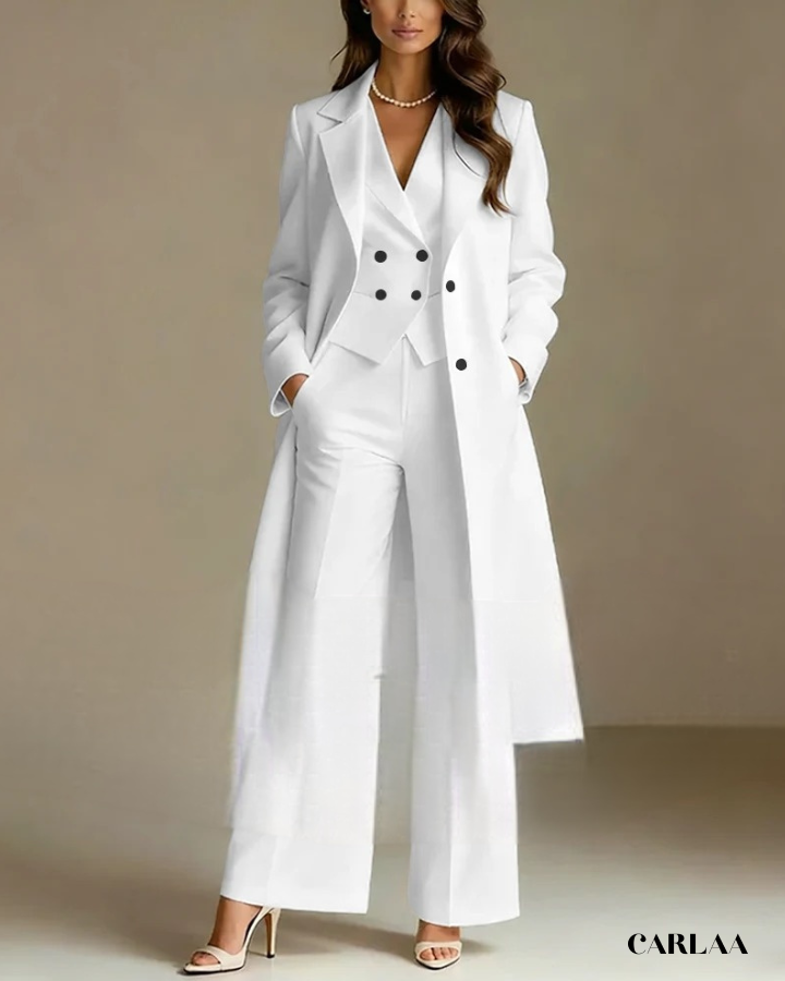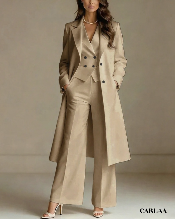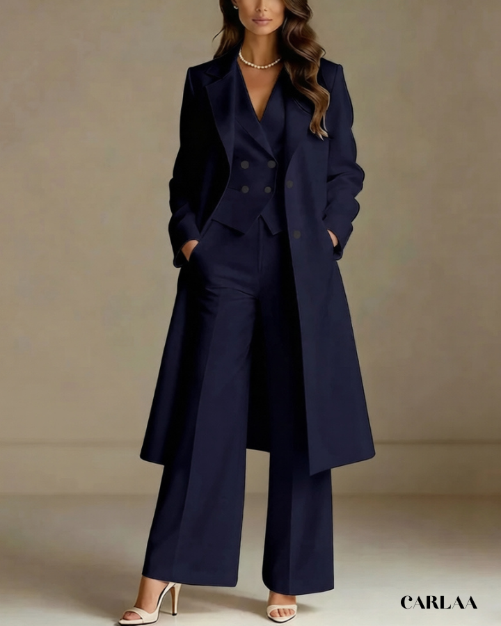 L'ensemble trois pièces coordonné te permet de moduler ton style avec sophistication selon les moments de la célébration. La longue veste cape croisée crée une silhouette majestueuse et allongée qui flatte harmonieusement toutes les morphologies avec une bienveillance remarquable. Le gilet ajusté en dessous sculpte délicatement ta silhouette tout en apportant cette structure flatteuse qui met en valeur ta féminité naturelle. Le pantalon droit à coupe classique offre un confort optimal tout en maintenant cette ligne épurée essentielle aux grandes occasions. Ce tailleur pantalon mariage femme 50 ans célèbre ta beauté mature avec un design qui comprend et honore l'évolution de ton corps. Les revers impeccables et la double boutonnière témoignent d'une attention méticuleuse aux détails qui caractérise les pièces d'exception. Accessoirise avec un collier de perles classique et des sandales raffinées pour incarner cette femme radieuse qui sait exactement qui elle est et ce qu'elle veut lors de toutes tes célébrations importantes.