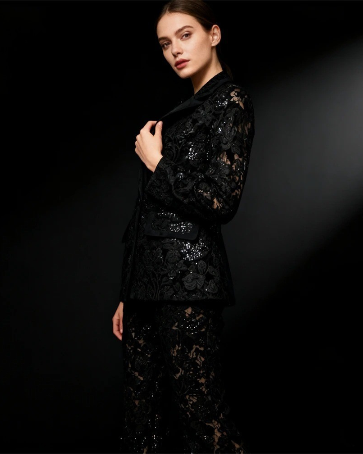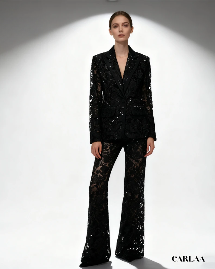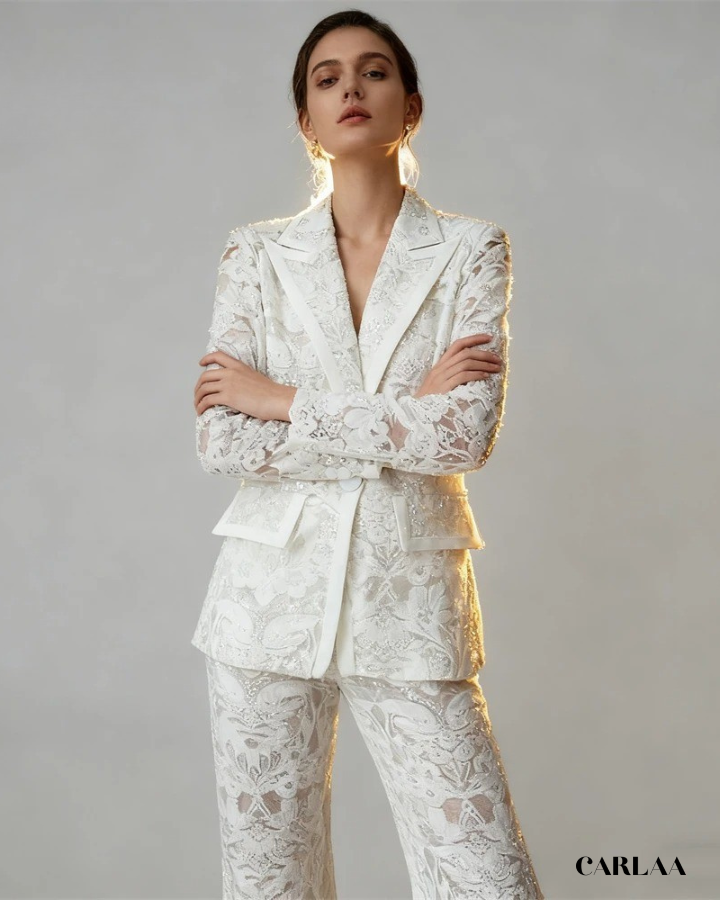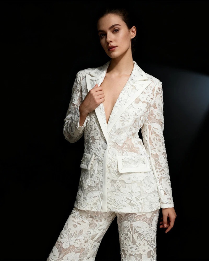 Redécouvre l'élégance intemporelle avec ce somptueux tailleur pantalon mariage femme 60 ans qui célèbre la féminité mature avec raffinement et modernité. La veste structurée à col tailleur classique se pare d'une dentelle florale délicate rehaussée de perles subtiles qui captent la lumière avec discrétion. Les manches longues en dentelle transparente apportent cette touche de sophistication légère tandis que la basque asymétrique sculptée crée un mouvement élégant qui affine la silhouette. Le pantalon droit à la coupe impeccable en dentelle doublée garantit confort et maintien tout en conservant cette allure distinguée. Cet ensemble incarne le parfait équilibre entre tradition et modernité, idéal pour la mère de la mariée ou toute femme d'expérience qui souhaite rayonner lors d'une cérémonie. La richesse des broderies et la qualité exceptionnelle du tissu témoignent d'un savoir-faire couture qui sublime ta beauté naturelle. Choisis cette pièce d'exception qui affirme ton style avec assurance, élégance et une touche de glamour intemporel.