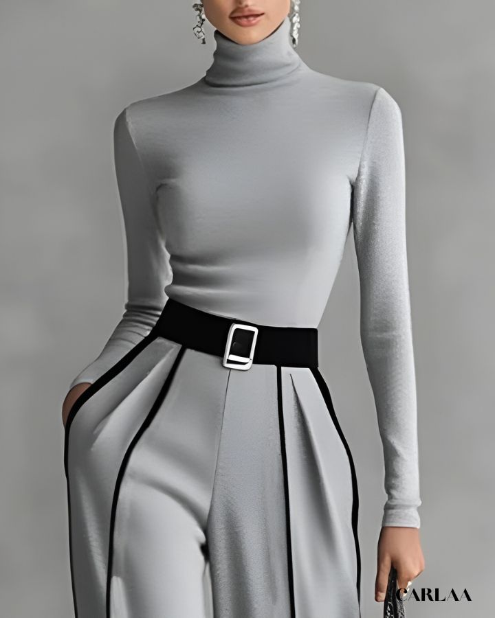 Composée de deux pièces – un col roulé ajusté et un pantalon taille haute fluide – elle allie minimalisme et allure couture. Le pantalon large à plis marqués élance la silhouette, tandis que la ceinture contrastante souligne délicatement la taille pour un effet structuré et féminin.