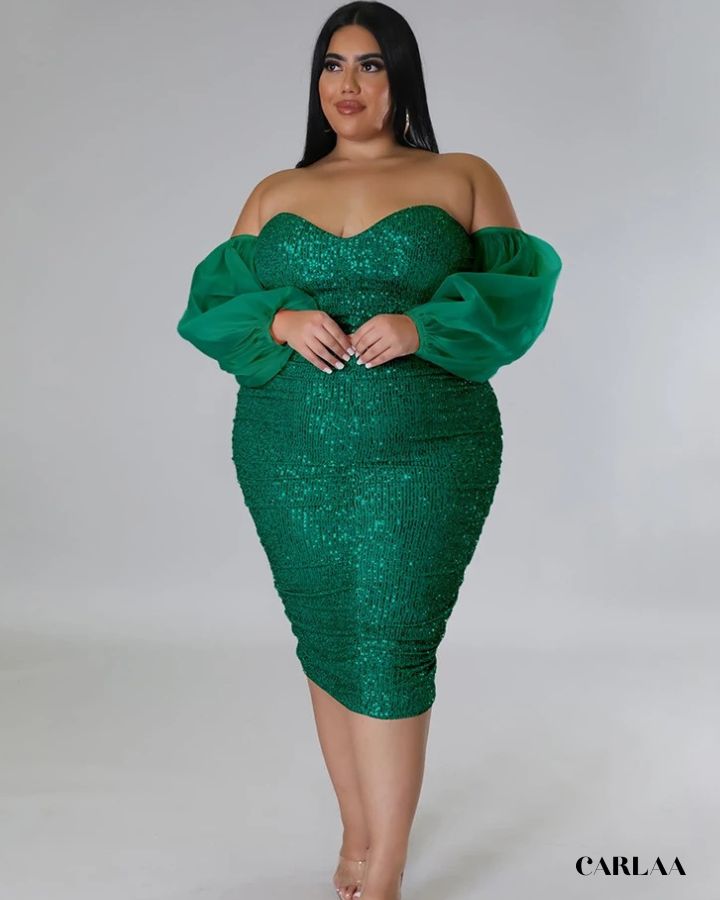 Affirme ta féminité généreuse avec cette tenue de reveillon femme grande taille qui célèbre les courbes pulpeuses tout en offrant une élégance glamour absolument irrésistible. Le bustier entièrement recouvert de sequins scintillants sublime délicatement ton décolleté et crée un effet lumineux spectaculaire qui capte tous les regards. Les manches amovibles bouffantes en mousseline vaporeuse ajoutent une touche de romantisme et de sophistication tout en te permettant de moduler ton look selon tes envies. La coupe fourreau parfaitement ajustée épouse harmonieusement tes courbes généreuses et sculpte ta silhouette avec élégance sans jamais comprimer.