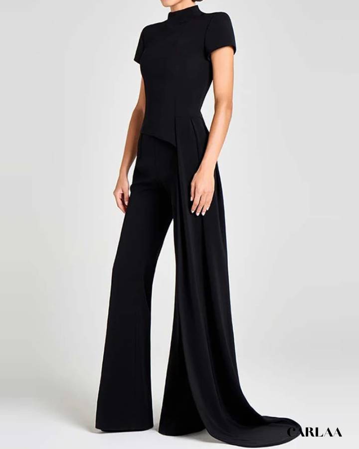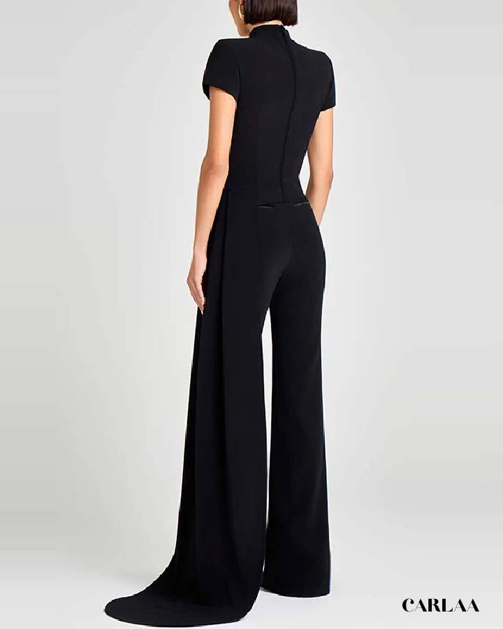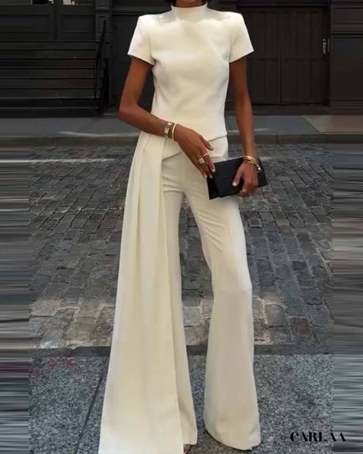 Ce deux-pièces associe un haut ajusté manches courtes à un pantalon fluide aux jambes larges, pour une allure élancée et sophistiquée. Le pan drapé sur le côté apporte une touche de mouvement et de raffinement, idéale pour se démarquer avec subtilité.
