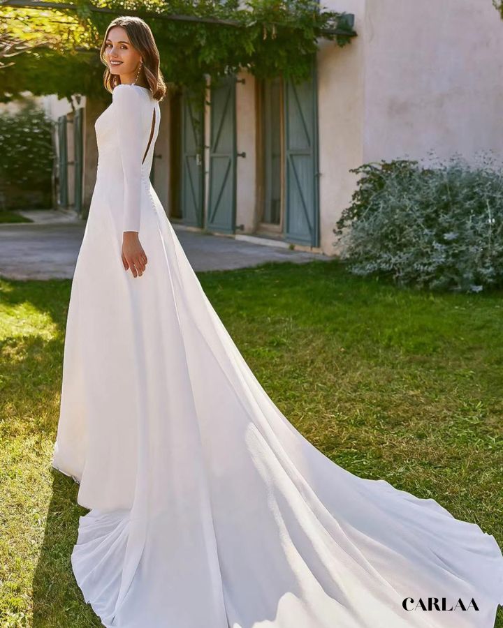 Sublime et intemporelle, cette tenue de mariage à manches longues incarne l’élégance moderne.