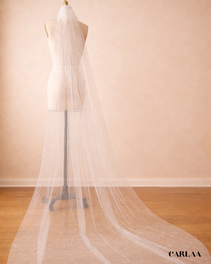 Sa longueur majestueuse est parfaite pour une entrée inoubliable, tandis que les perles ajoutent une touche de lumière et de sophistication. Ce voile est conçu pour compléter harmonieusement ta robe de mariée, ajoutant juste ce qu'il faut de brillance pour te faire rayonner.
