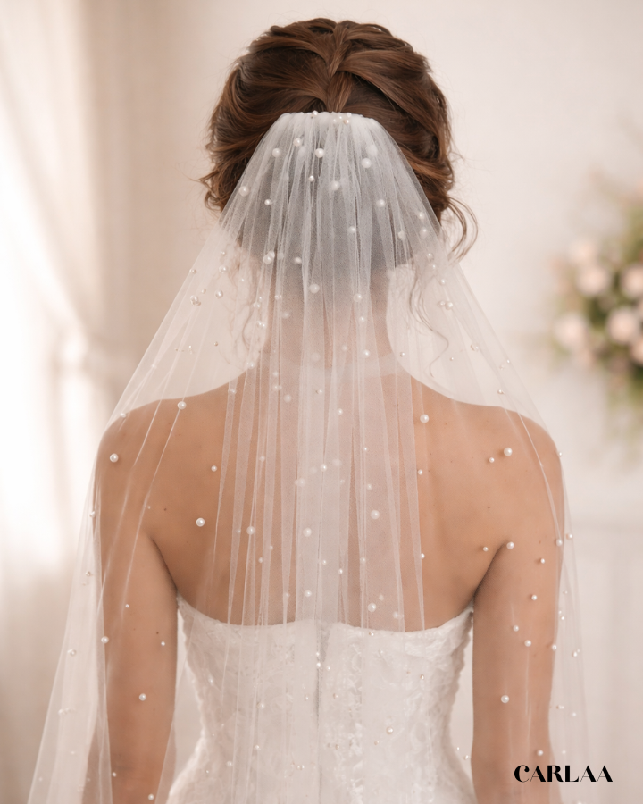 Voici la quintessence du charme pour ton grand jour : un voile de mariée sublimé par de délicates perles distribuées avec une élégance raffinée.